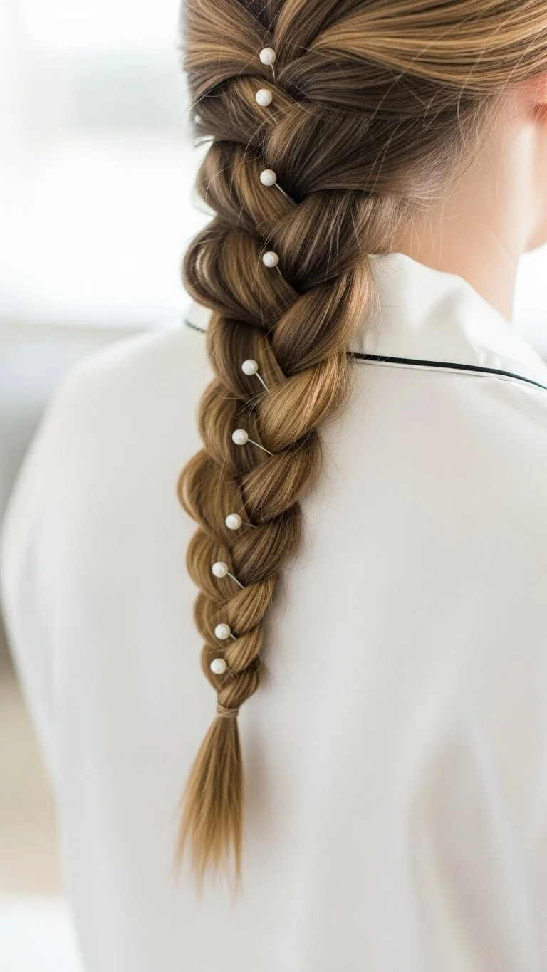 Take a simple braid and make it “high-fashion” by adding pearls. You can buy a pack of flat-backed craft pearls and glue them to bobby pins. Scatter them throughout your braid or bun. This adds a level of detail that looks very expensive but costs pennies. It is a beautiful choice for a wedding anniversary or a very formal date. It pairs perfectly with white or cream-colored clothing.