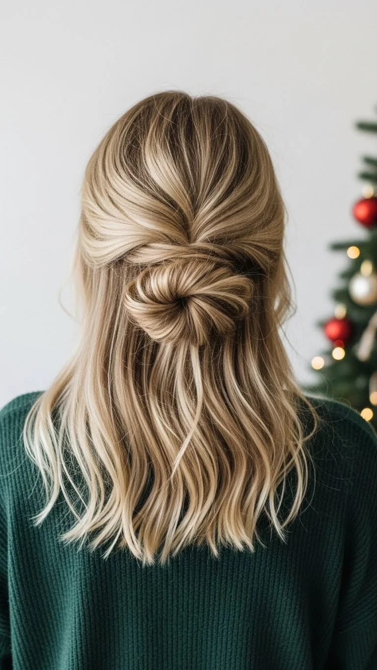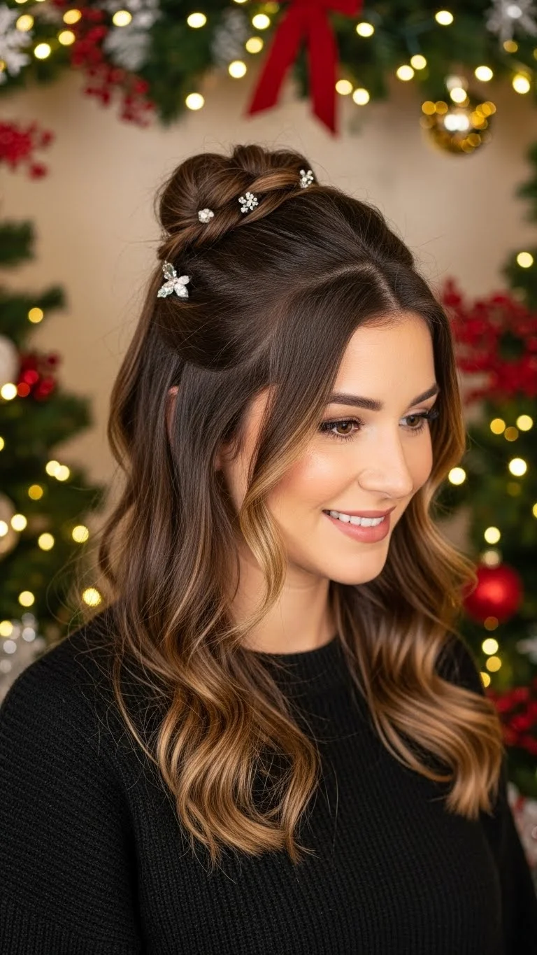 Create a chic half-up bun by pulling the top half of your hair back and securing it into a bun while leaving the rest down. This look blends style with ease, making it suitable for any holiday gathering. It’s a fun way to keep some hair out of your face while showing off lovely waves or curls.