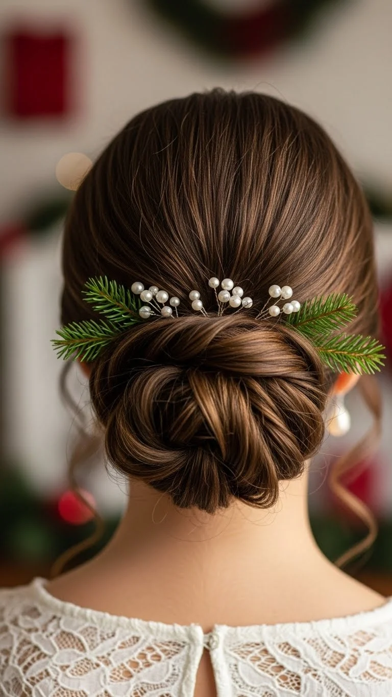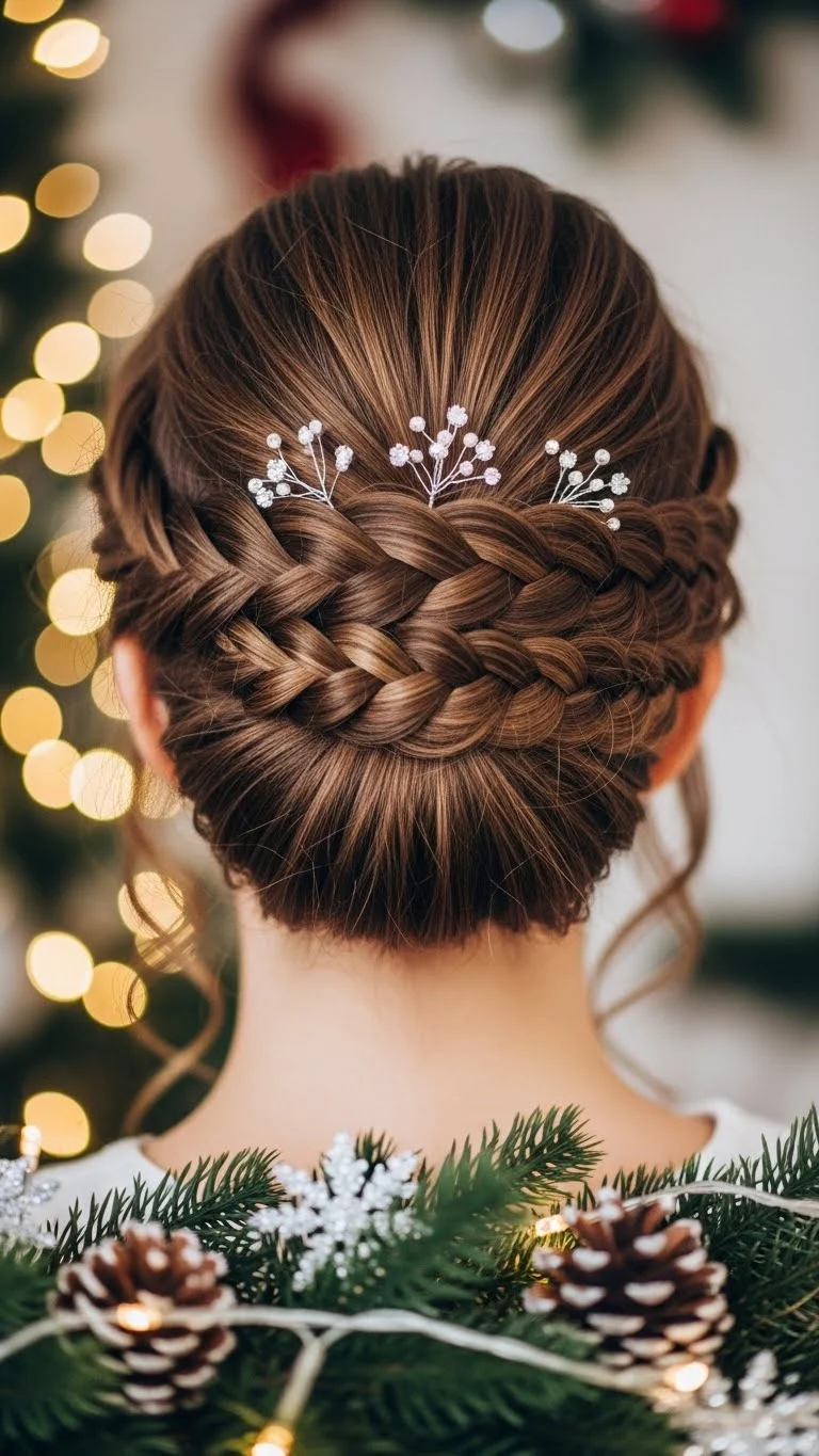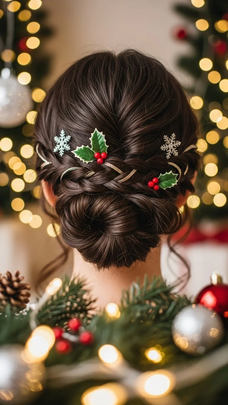 The twisted updo is ideal for formal events. Gather sections of your hair, twist them together, and pin them into a bun. Add seasonal accents like small decorations to finish the look. This style is both elegant and festive, perfect for any holiday affair.