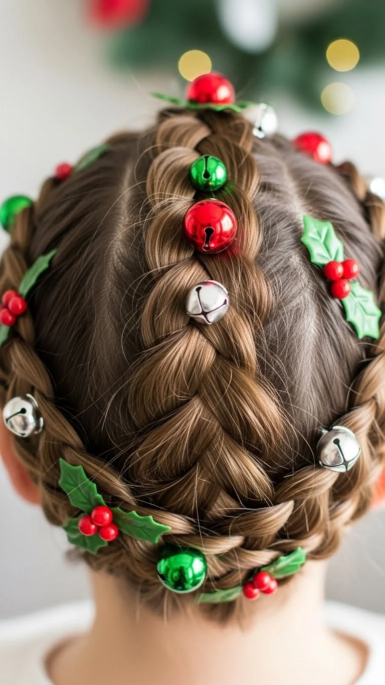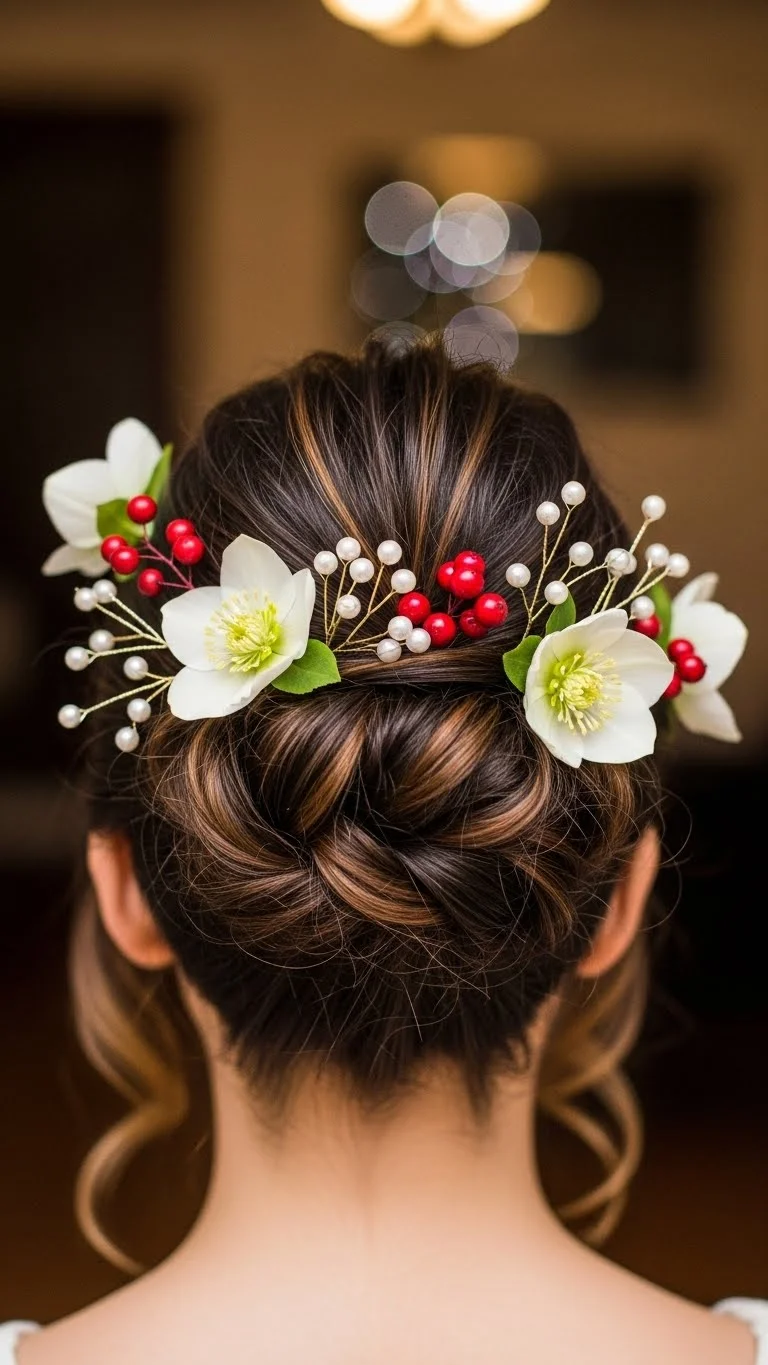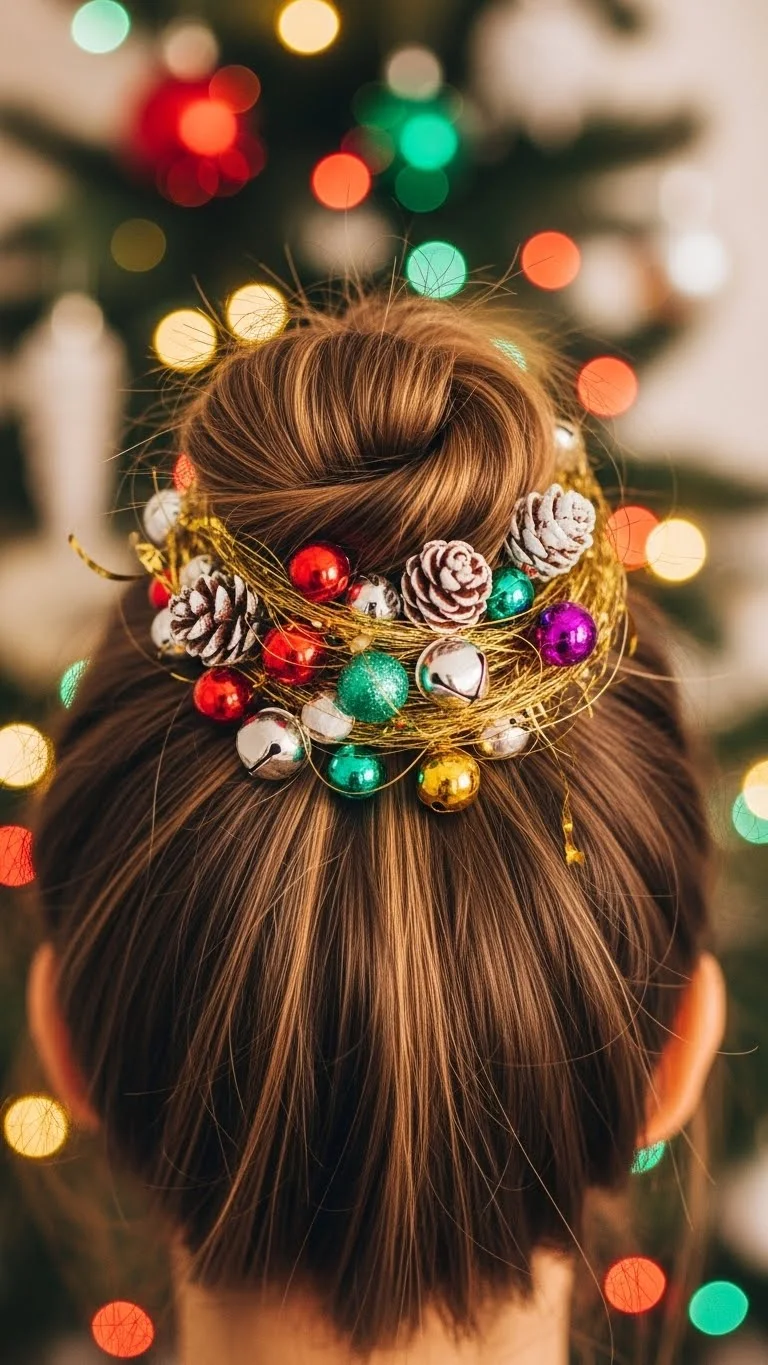 The twisted updo is ideal for formal events. Gather sections of your hair, twist them together, and pin them into a bun. Add seasonal accents like small decorations to finish the look. This style is both elegant and festive, perfect for any holiday affair.