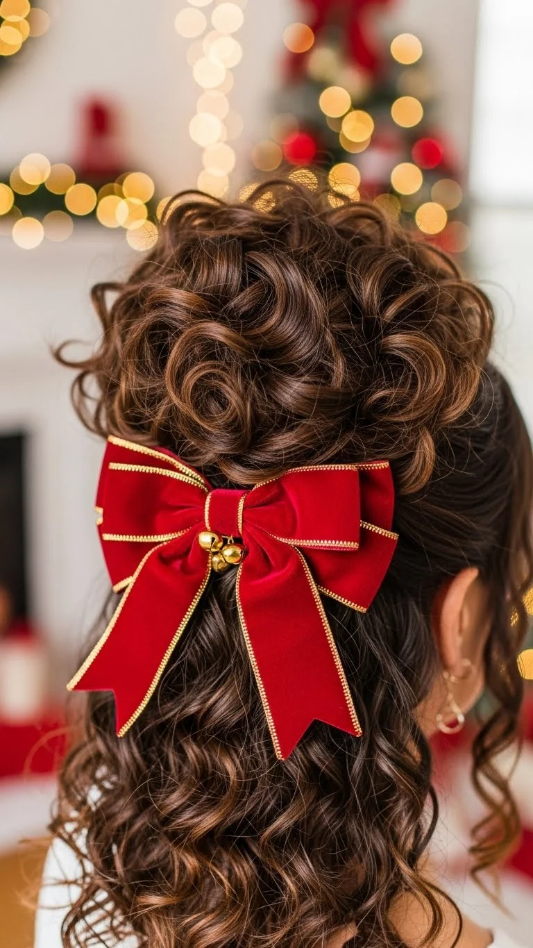 Bouncy curls create a lively vibe for any event. Use a curling wand for tight curls, then fluff them out with your fingers for fullness. Finish the look with a big festive bow for a fun twist. This hairstyle is perfect for parties, exuding energy and celebration.