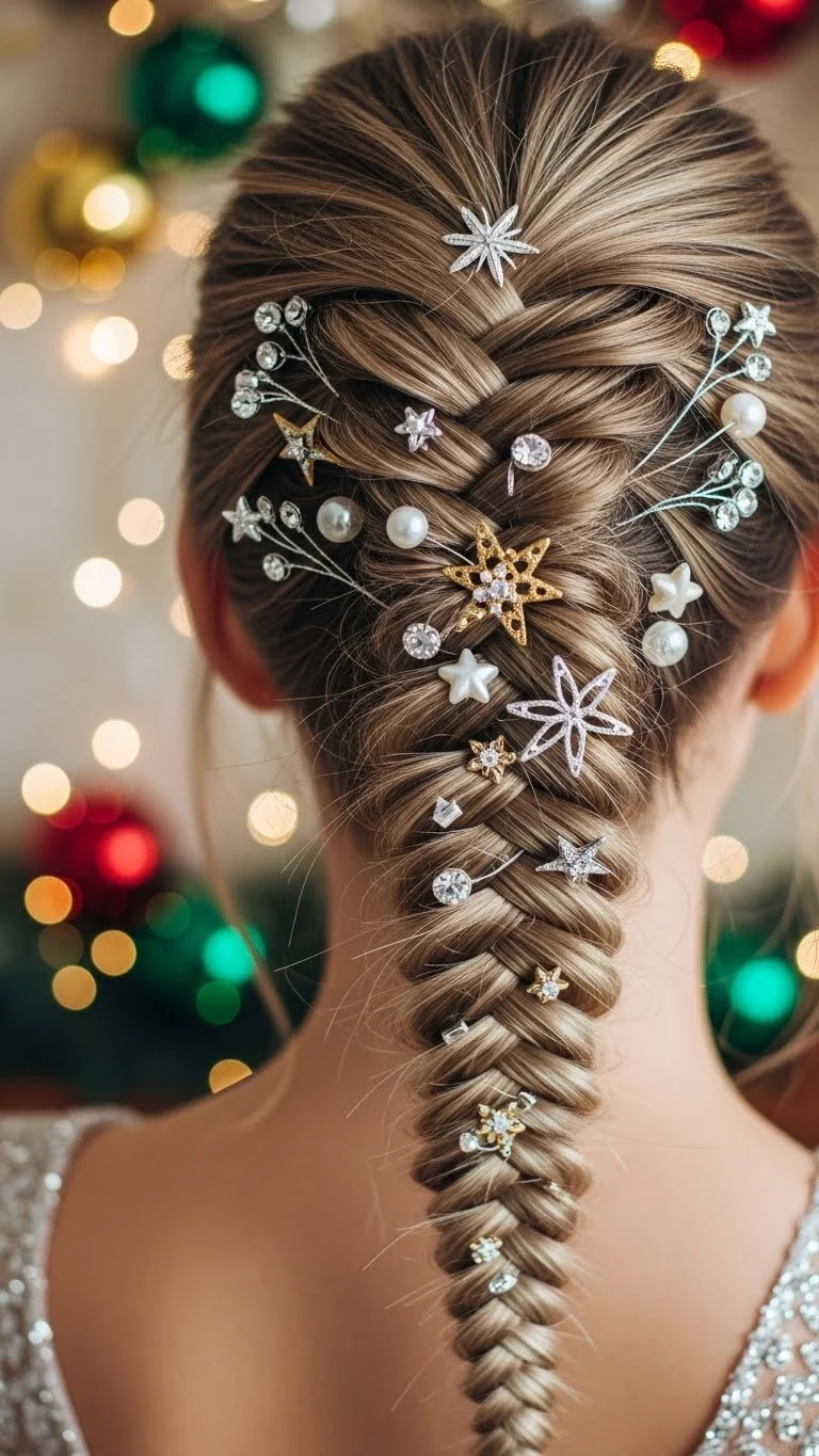 Want a festive touch? Try cascading curls! Use a curling wand to create loose waves that flow beautifully. Once styled, add some holiday-themed clips for a cheerful accent. This look is perfect for any gathering, providing an effortless yet elegant vibe. Simply spritz some hairspray to keep those curls bouncing through the night.