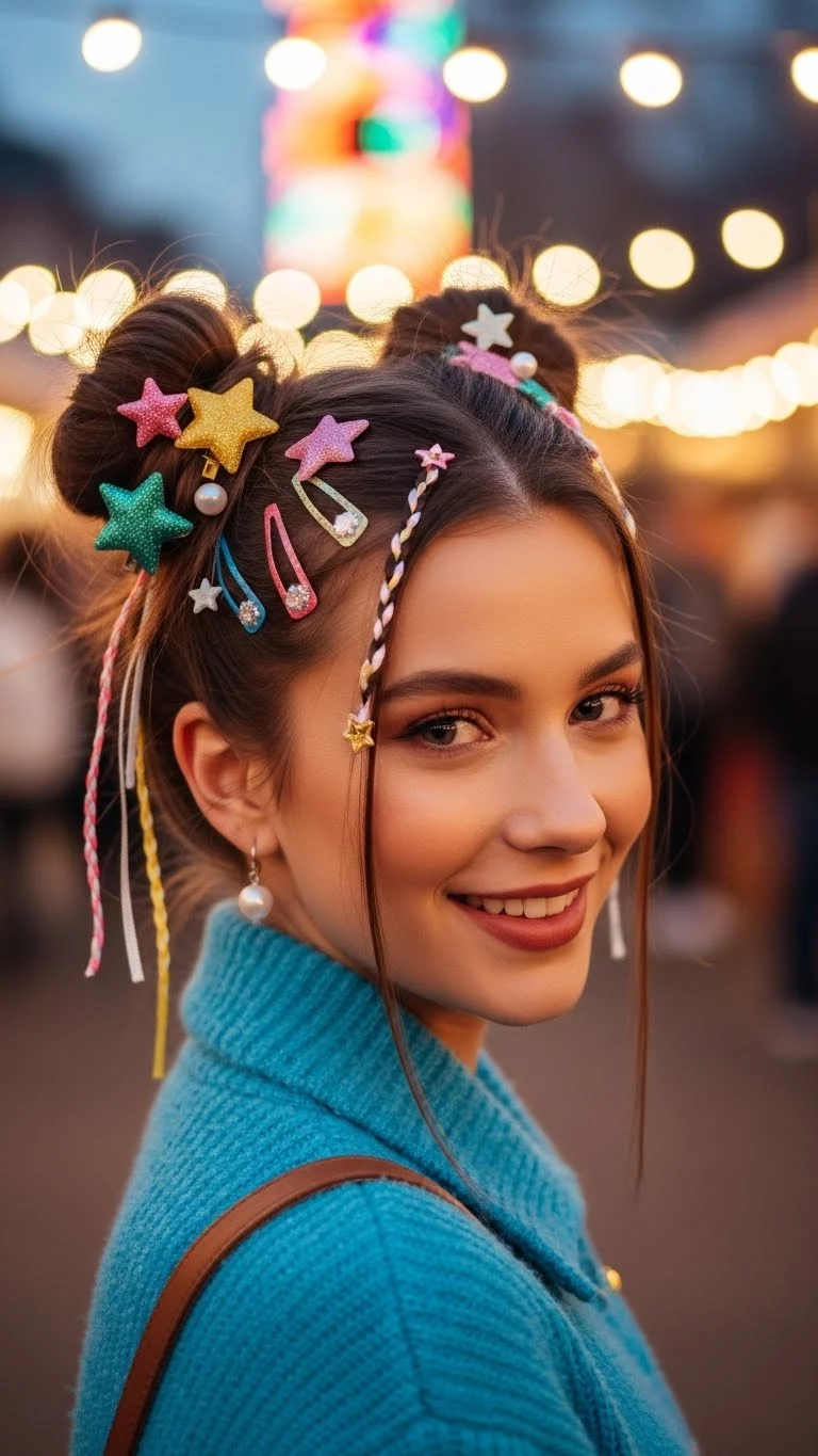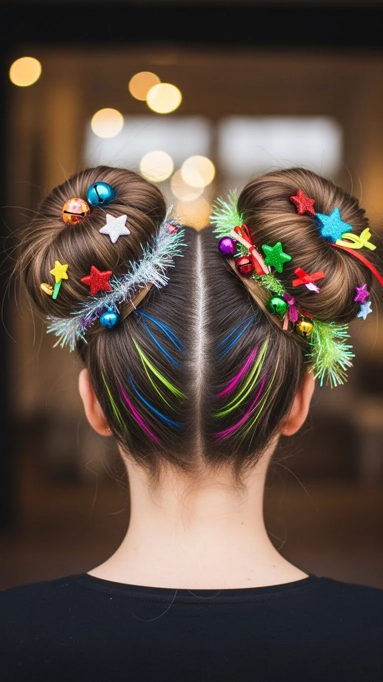 Space buns are a fun and quirky choice. Divide your hair into two sections and create two high buns. Secure with colorful clips. This playful hairstyle is perfect for casual gatherings or festive events, allowing you to keep it fun and lighthearted.