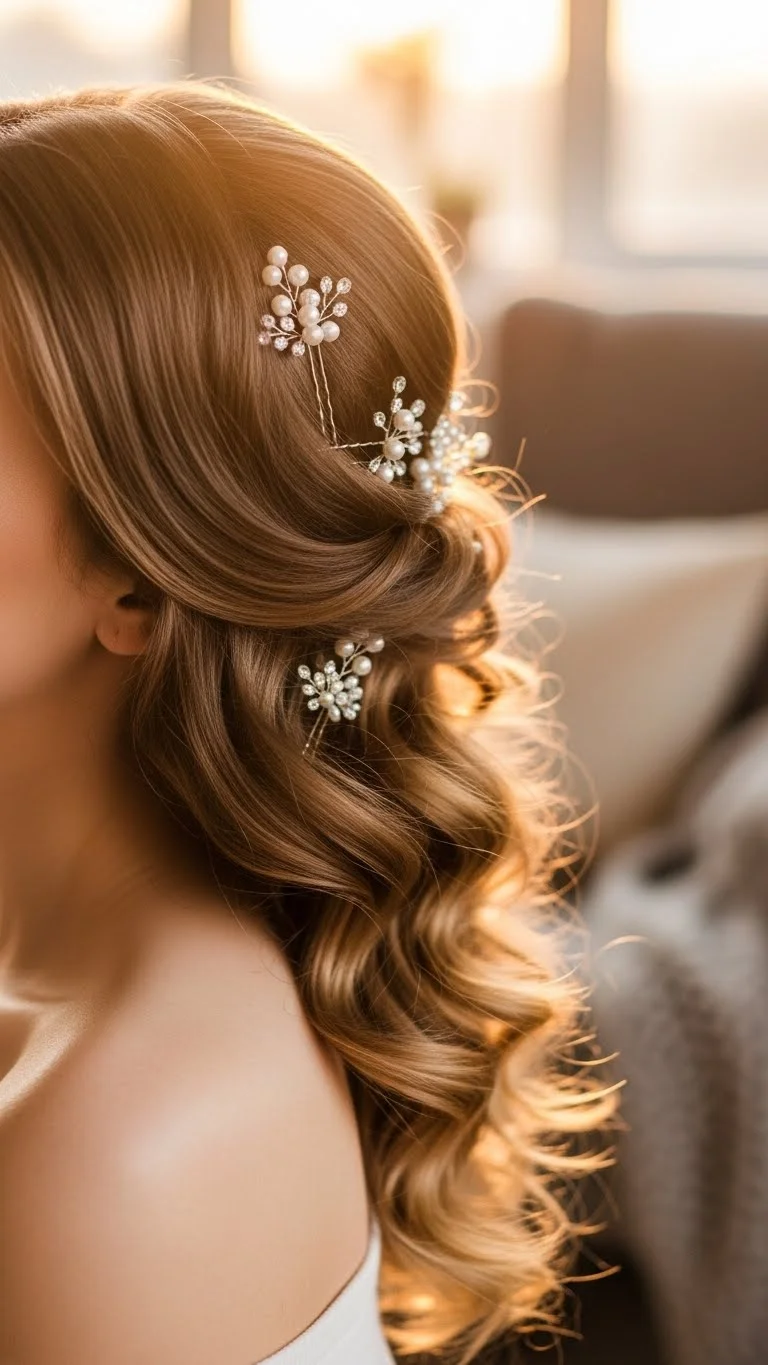Side-swept curls create an elegant, romantic appearance. Curl your hair and sweep it to one side, pinning it in place. Add a few decorative pins for a festive touch. This hairstyle is wonderful for evening events, capturing attention beautifully.