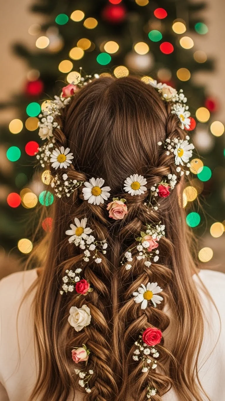 Boho braids combined with flowers create a lovely, natural look. Braid sections of hair and intertwine small flowers. Ideal for outdoor holiday events, this hairstyle brings a unique touch to your festive style.