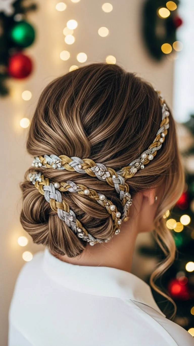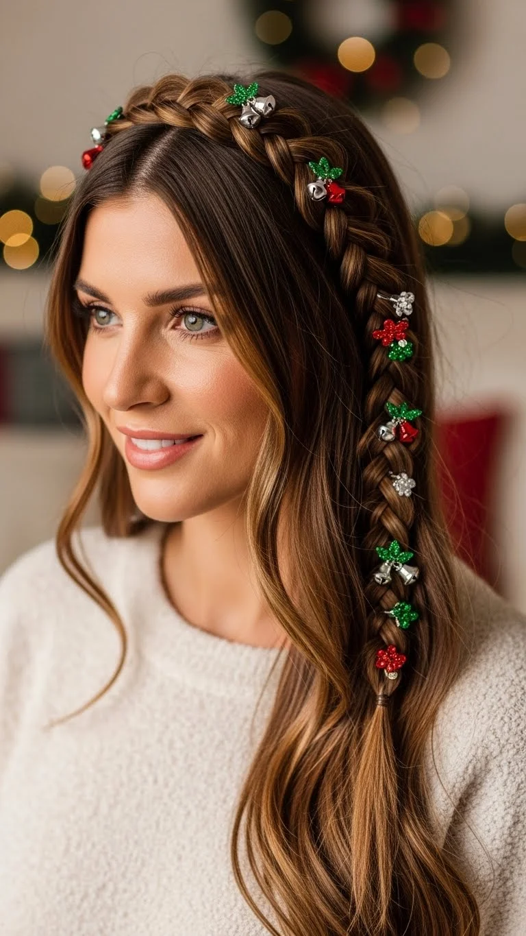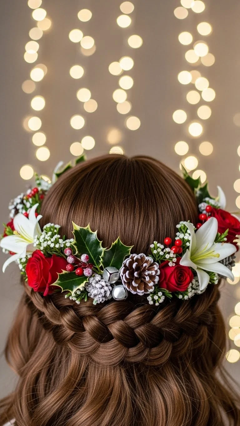 Create a headband out of a section of your hair by braiding it and wrapping around your head. This style is both charming and practical, keeping your hair away from your face. Decorate the braid with holiday-themed clips or small bells for added fun at gatherings.