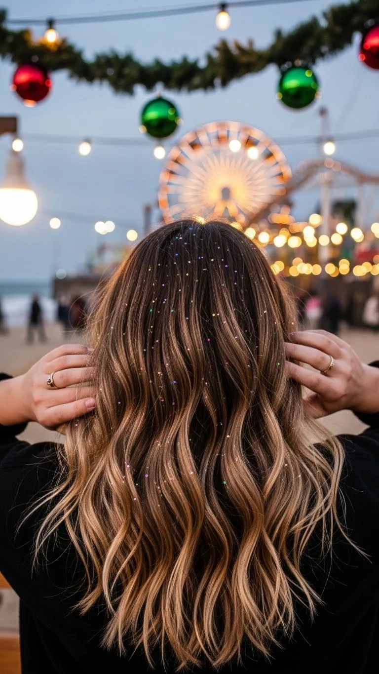 Beachy waves can be made festive by adding a subtle sparkle. Curl sections of your hair and finish with a spritz of glitter spray. This gives a fun, relaxed vibe, perfect for casual holiday events. It’s an ideal hairstyle requiring minimal effort for a maximum effect.