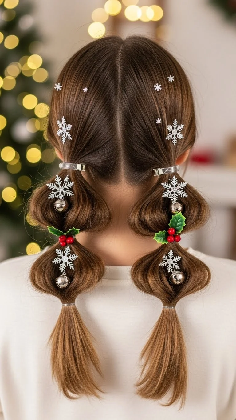 For a cute look, try double twists! Divide your hair into two sections and twist each section towards the back. Secure with small clips and add holiday-themed decorations. This hairstyle is quick to accomplish while showing off your fun personality.