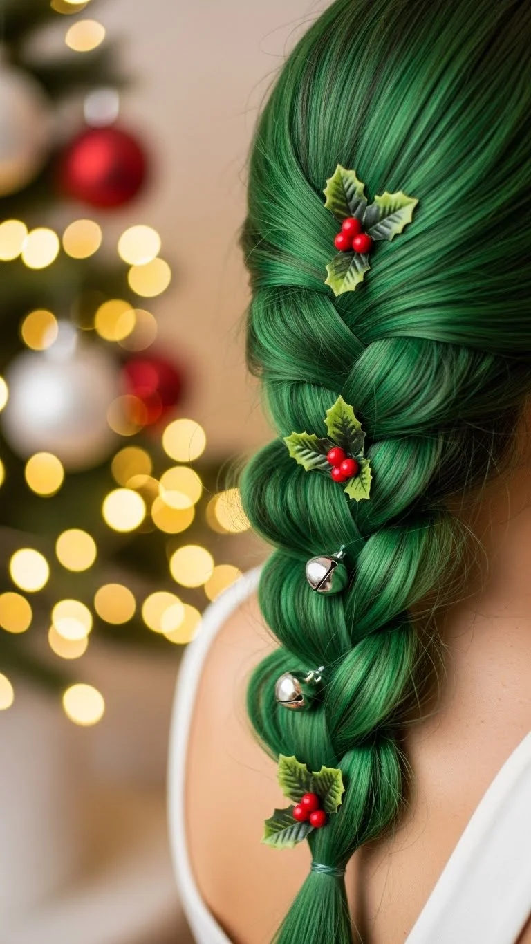 Add some fun to your braid with green hair extensions! Braid your hair and incorporate small green strands to reflect the elf spirit. This playful yet stylish vibe keeps your look fun and festive, perfect for any holiday celebration.