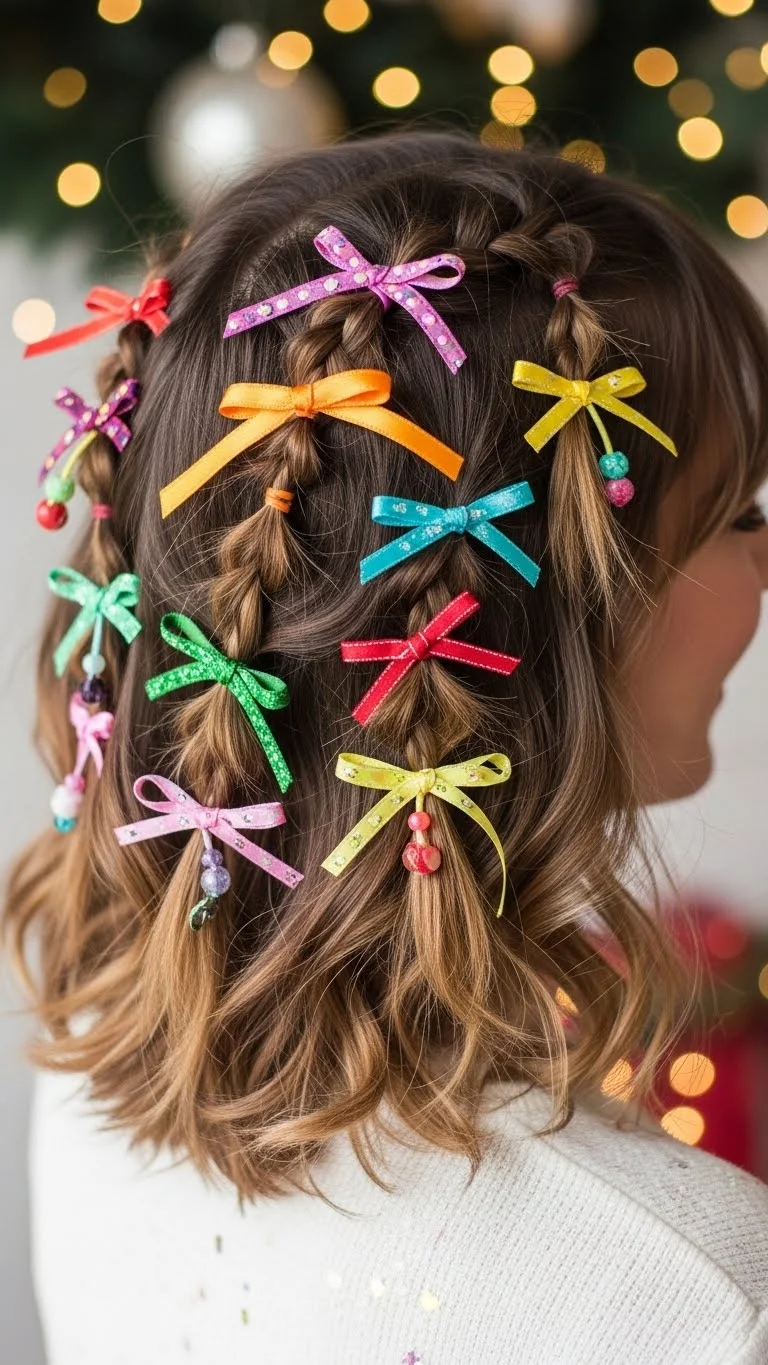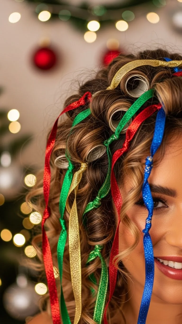 Loose curls can be enhanced with colorful ribbons for a festive touch. Use a curling wand to create soft, bouncy curls. Once styled, tie strips of colorful ribbon around random curls for an extra pop. This hairstyle exudes cheer and is perfect for holiday parties. It’s effortless to achieve while allowing you to showcase a fun, playful personality.
