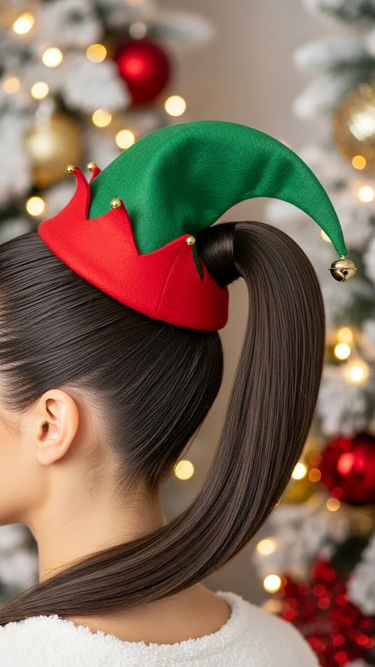 Achieve a sleek look by straightening your hair and adding a festive elf hat. This style is practical and chic, perfect for any holiday event. It allows you to maintain a stylish appearance while incorporating that elf theme effortlessly.