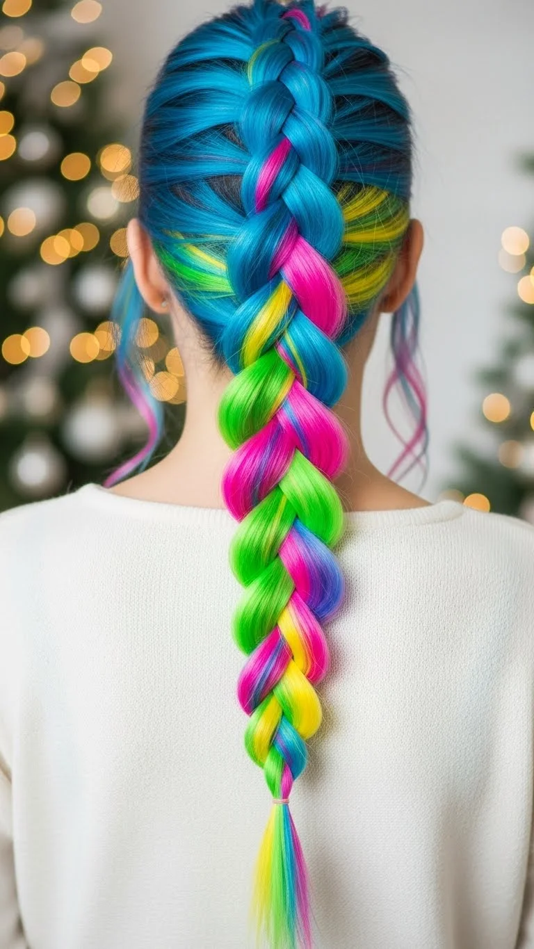 Use colorful hair chalk or extensions to create a funky unicorn braid. Incorporate multiple colors as you braid for a vibrant holiday look. This hairstyle is perfect for anyone looking to express their unique style during the festive season.