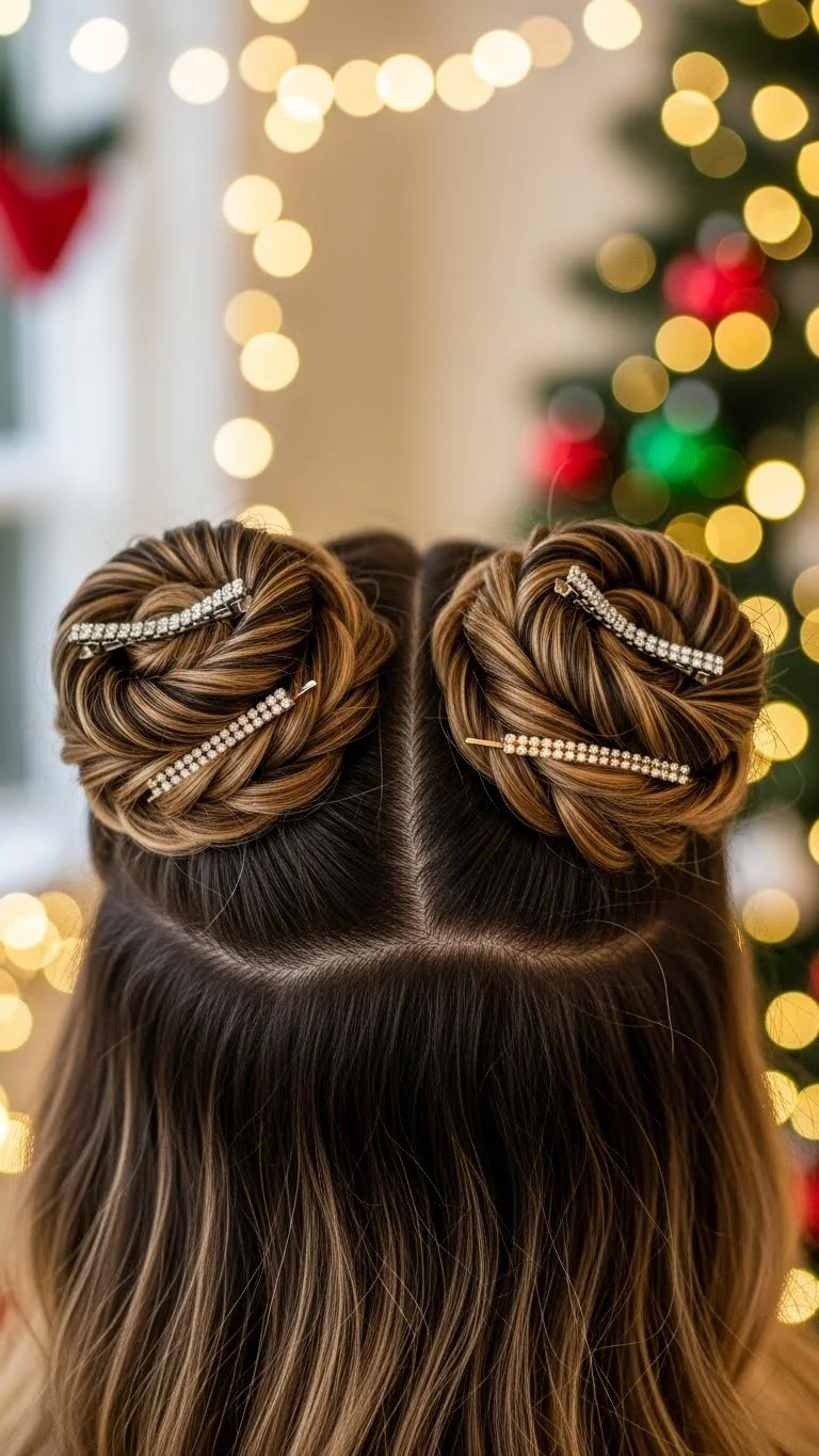 Twisted buns are trendy and can give off a magical elf vibe. Start by gathering your hair into two sections. Twist each section and wrap them into buns. Secure with bobby pins. For extra fun, add colorful clips or ornaments. This hairstyle keeps your hair neat and is great for both kids and adults, making it ideal for holiday events or playful photo sessions.