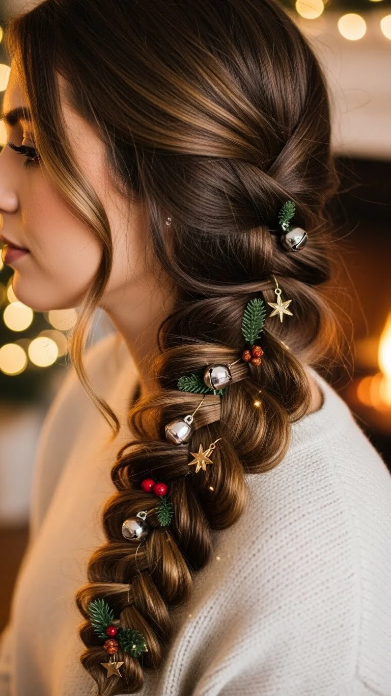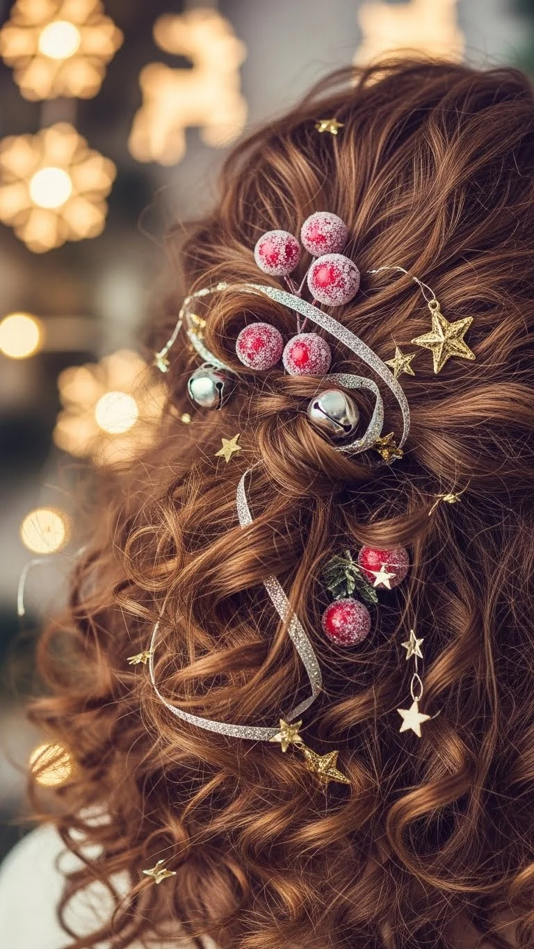 Embrace your natural curls and enhance them with small ornaments woven throughout. Use a curling wand if needed, and finish with a light hair spray. This playful hairstyle embodies the spirit of an elf and is perfect for celebrating the holidays with joy.