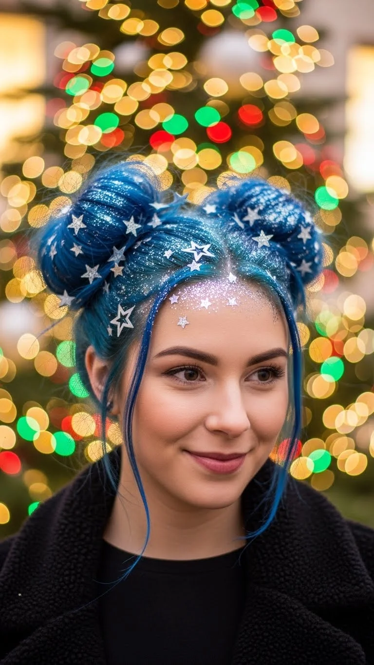 Space buns are an instant mood booster! Divide your hair into two sections and create two high buns. Use hair gel and glitter to give them a sparkle effect. This hairstyle is festive and playful, making it perfect for celebrations or casual get-togethers. It’s easy to create and keeps hair out of your face.