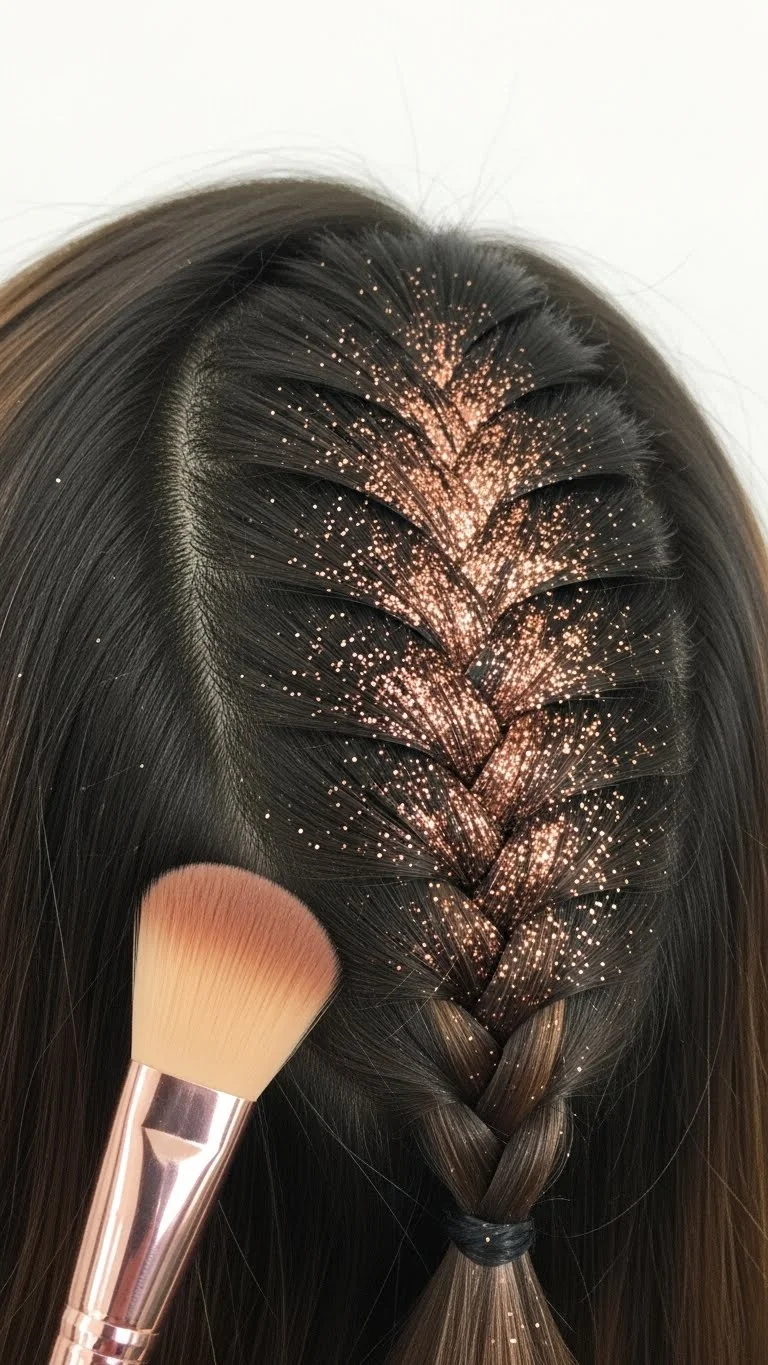 This is a fun way to hide roots or add flair to a simple hairstyle. Applying glitter to your hair part is a major trend for events. It looks like jewelry for your hair. Mix loose rose gold glitter with clear hair gel. Apply it with a flat foundation brush. This cheap styling trick stays in place all night and washes out with regular shampoo. It’s a great way to use up extra craft glitter.