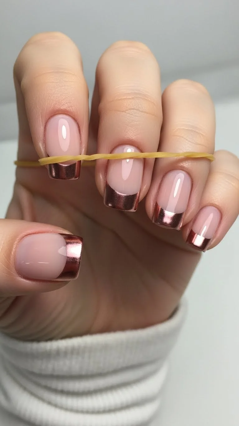 The French manicure gets a modern update with metallic tips. Instead of white, use a rose gold polish. It looks chic and grows out better than a solid color. You won’t notice chips as easily either.For a realistic DIY, use a rubber band as a guide. Place it across your nail and paint the tip. It gives you a clean line every time. You can also use a rose gold sharpie for fine details, then cover it with a clear topcoat. This saves you a trip to the salon and looks just as professional.