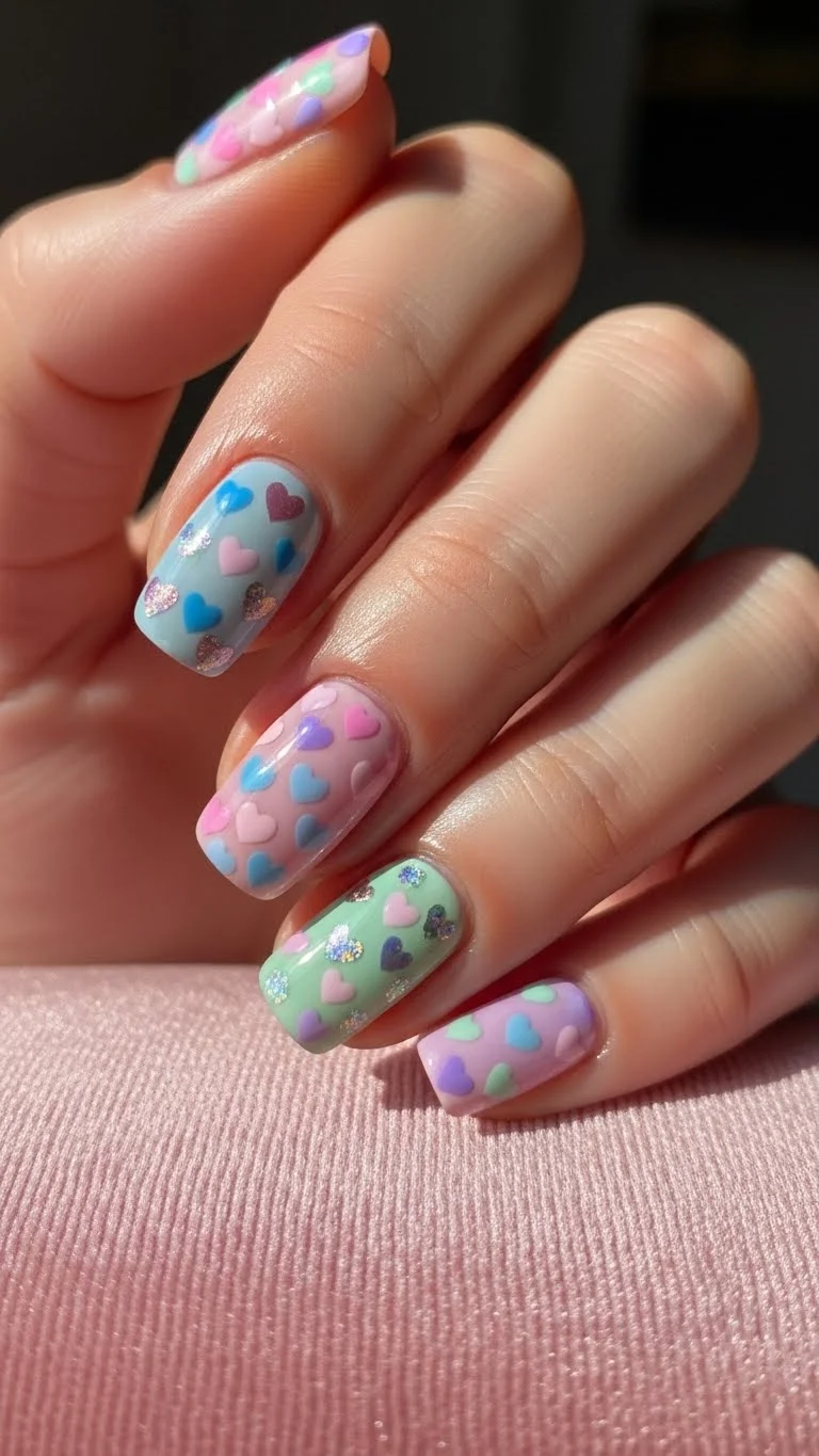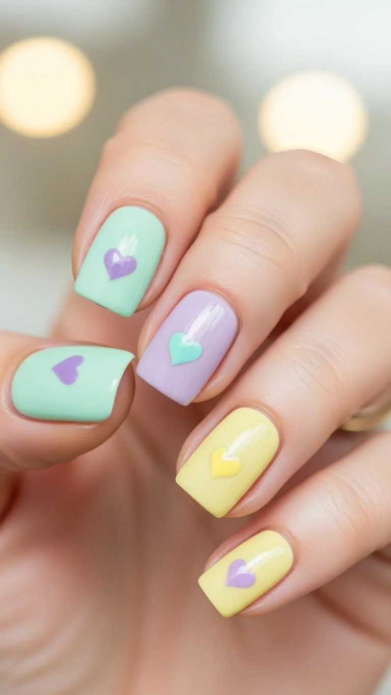 Inspired by Valentine’s candy, this look uses a variety of soft colors. Pick five different pastel shades for each finger. This variety makes the design fun and playful. You can use any colors you already have in your collection. To save money, create your own pastels. Mix a drop of a bright color with several drops of white polish on a piece of foil. This lets you get a custom look without buying five new bottles. It is a smart way to expand your kit.