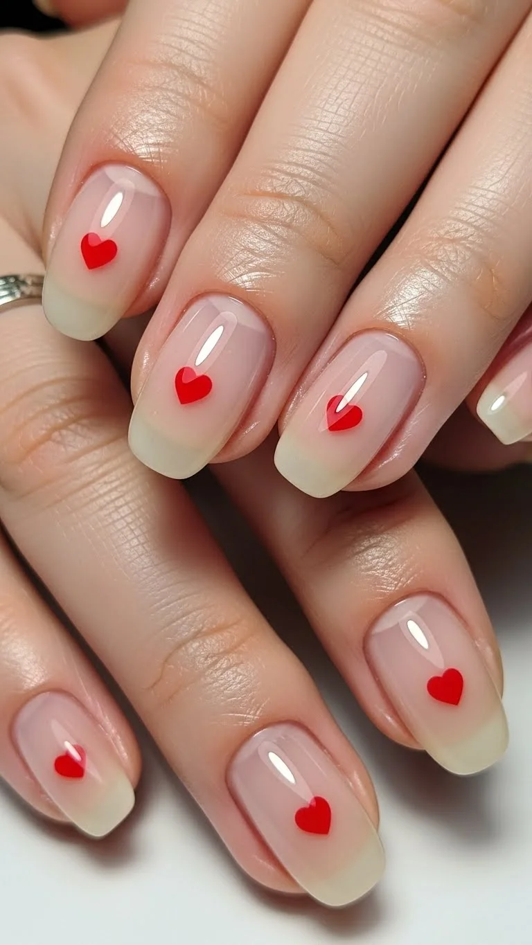 Simple red hearts on a nude base are timeless. This look is clean and works for the office or a night out. You only need a toothpick or a dotting tool to master this. Dip the tip into red polish and make two small dots side by side. Drag them down to a point to form the heart. It is quick and looks very polished. For a budget fix, use a red sharpie on dry nude polish. Just seal it with a clear top coat so it does not smudge. This keeps your costs low while giving you a precise shape. It is a great entry point for beginners.