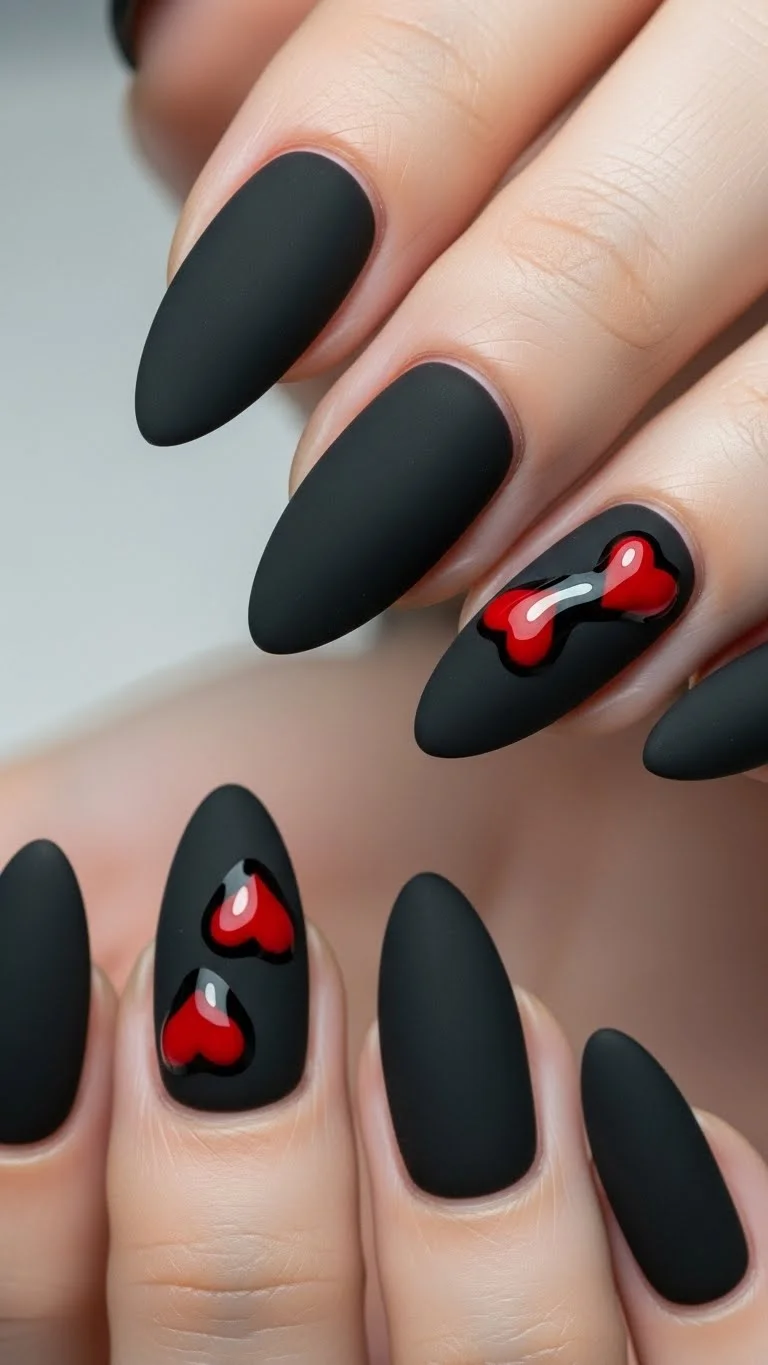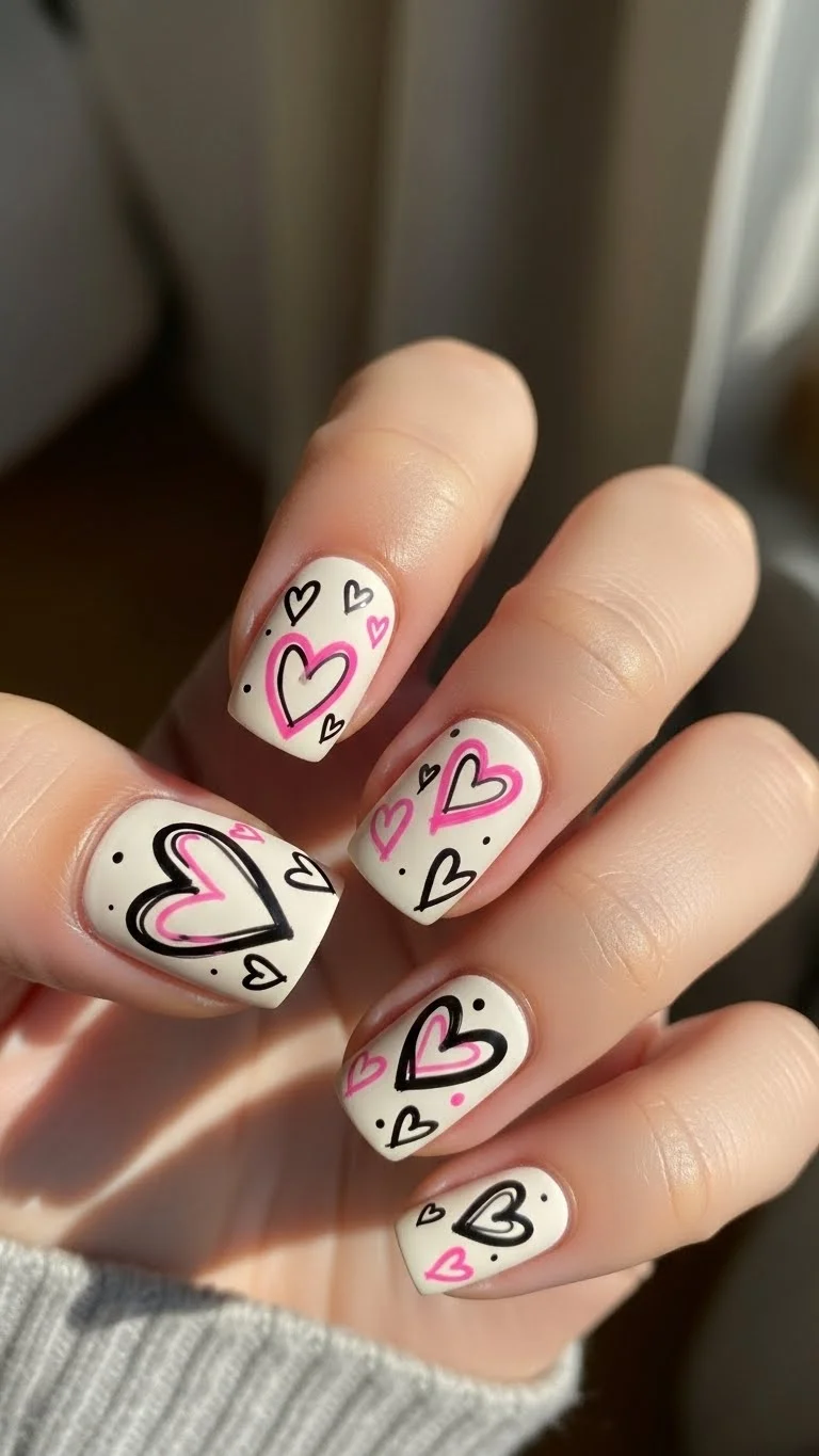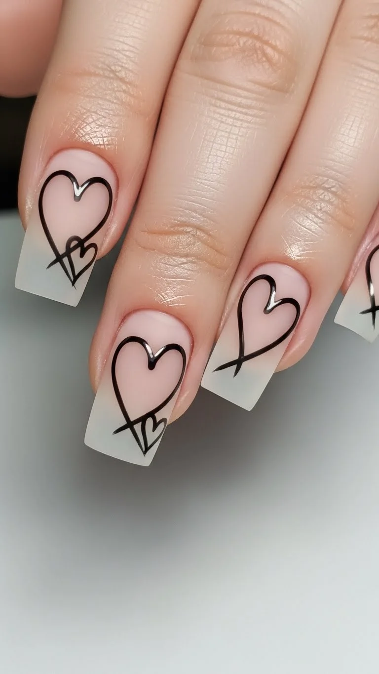 Black outlines offer a modern, edgy take on the sweetheart theme. It is less sugary than pink but still very cute. Use a thin detail brush for the best results. If your hand is shaky, try using a black gel pen on top of matte polish. This style looks best on a natural nail or a clear base. It saves money because you don’t need a colored base coat. It is a low-maintenance look that hides growth well.