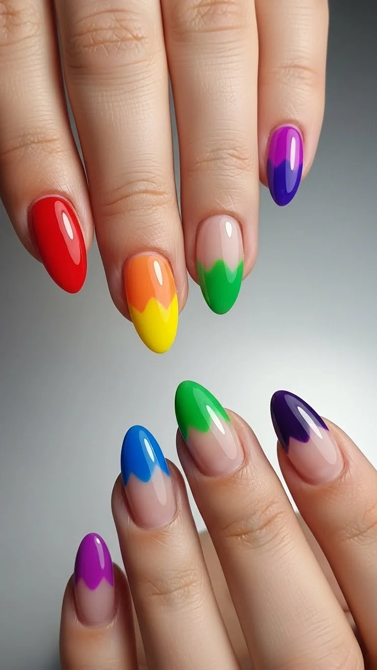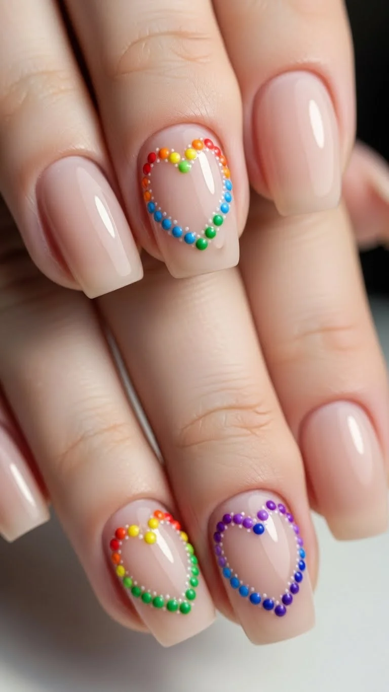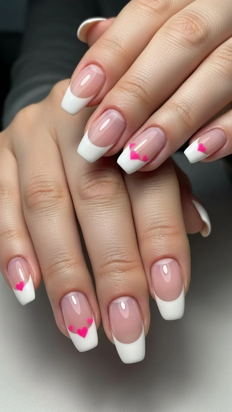 Instead of a straight French tip, make the tip itself a heart. You draw two bumps at the top of the nail that meet in the middle. Do each finger in a different rainbow color for a bright, happy vibe. This design actually helps hide nail growth. Since the color is only at the tip, you can wear it longer. It is a great way to use up those half-empty bottles of bright polish you have sitting around.