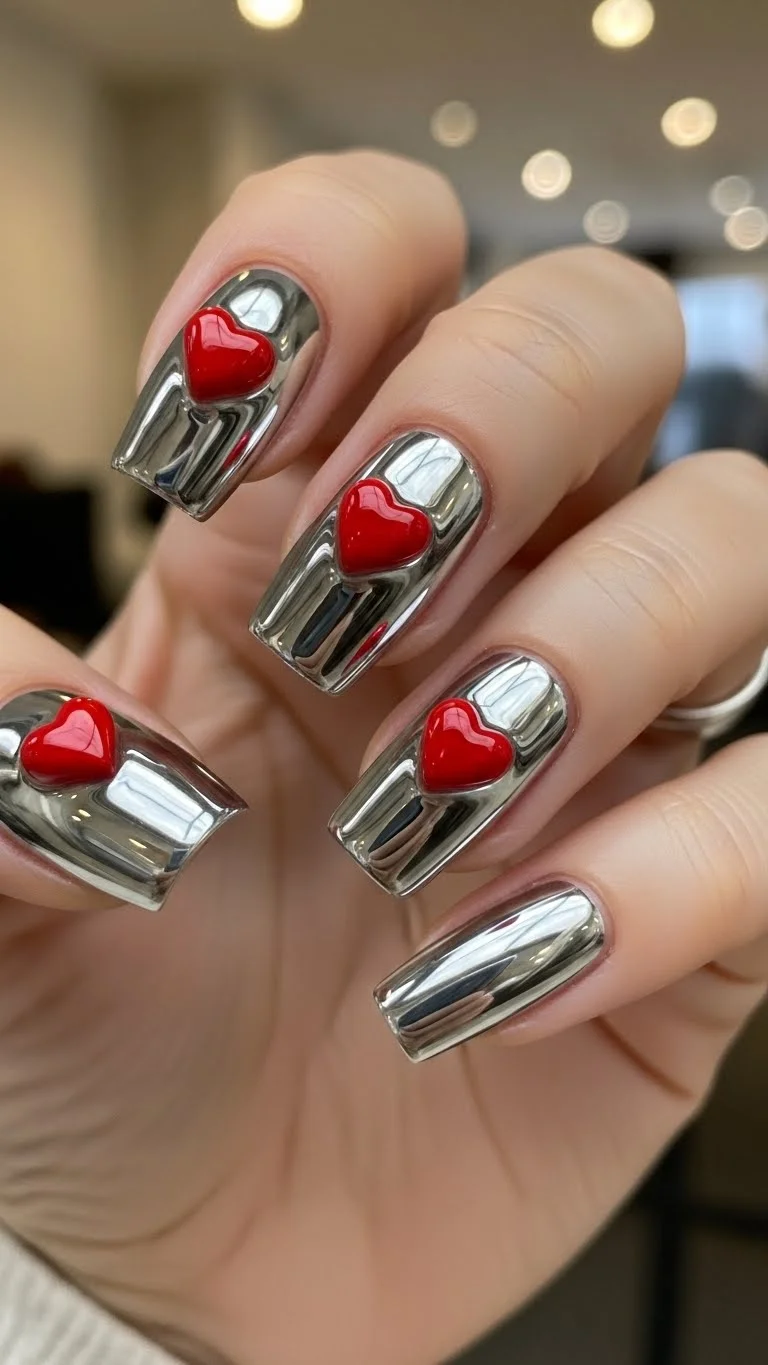 Chrome nails are trending, and they pair perfectly with hearts. You can use chrome powder over gel or look for chrome-effect regular polish. Add a 3D heart charm for a bold, Y2K-inspired look. Buy charms in bulk to save money. You can often find sets of 50 or 100 for a few dollars. Use a tiny drop of nail glue to secure them. They can even be reused if you soak them off carefully.