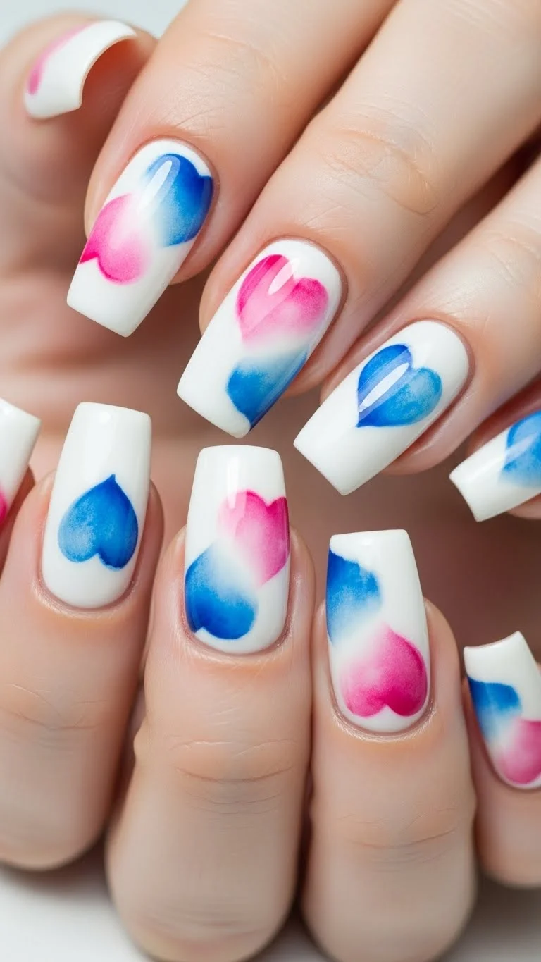 Watercolor art looks like a painting on your nails. To do this, put a drop of polish on a palette and mix it with a little nail polish remover. This thins it out and makes it transparent. Dab the thinned polish onto a white base in heart shapes. The colors will bleed slightly at the edges for a soft look. It is a very cheap way to get a high-end, custom art style.