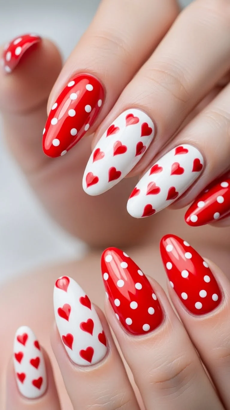 Mixing patterns keeps things interesting. Do hearts on two fingers and polka dots on the others. This breaks up the design and makes it look more professional. Red and white is a classic choice for this. Use the same tool for both the dots and the hearts. This keeps the scale of the patterns consistent. It is a playful look that is very easy to achieve even for total beginners.