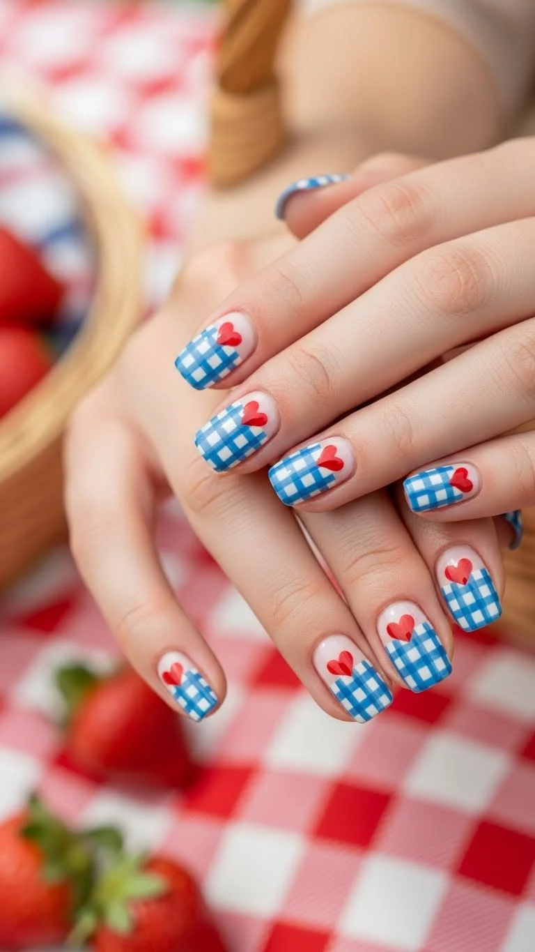 Gingham is a sweet, summery pattern. You can draw thin crossing lines to create the checks. Add a heart on top for the ultimate sweetheart look. It is a bit more time-consuming but worth the effort. To make the lines straight, use thin striping tape. You can buy a huge roll for a dollar. Lay the tape down, paint over it, and peel it up. It makes the “pro” look accessible to everyone.