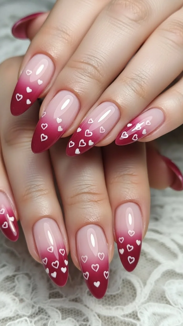 Ombre nails provide a beautiful backdrop for heart art. Start with a light pink at the base and sponge on a darker shade at the tips. Once dry, add your sweetheart accents. This creates depth without requiring complex skills. Use a makeup sponge from the dollar store for the gradient. If you find drawing hearts difficult, use nail stickers. You can find packs of heart decals online for just a few dollars. Apply them over the ombre and press down firmly. Always finish with a thick top coat to prevent peeling.