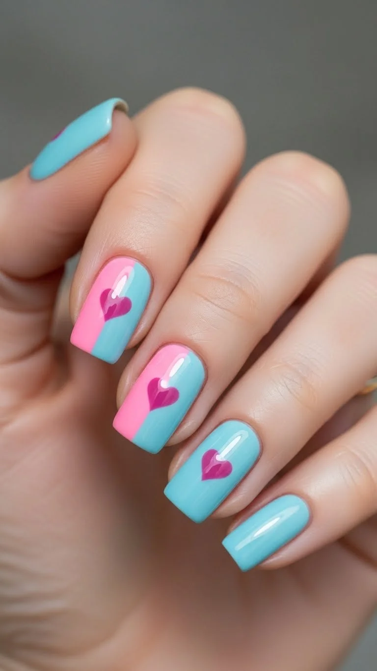 Split your nail down the middle with two colors, like pink and red. Then, draw a heart in the center using the opposite colors. It is a clever visual trick that looks very modern. Use masking tape to get a perfectly straight line down the middle. This ensures the base is clean before you add the heart. It is a bold look that uses colors you likely already own.