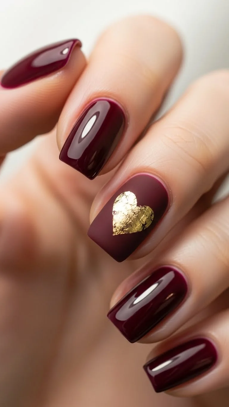 Gold foil adds an expensive feel to your manicure. You can buy small pots of nail foil very cheaply. Apply a heart-shaped dab of clear polish and press the foil onto it. The result is a textured, shimmering heart that catches the light. This design looks great on a dark base like navy or forest green. It makes the gold pop. If you don’t have foil, a gold metallic sharpie works surprisingly well. It gives a similar reflective finish for a fraction of the cost.