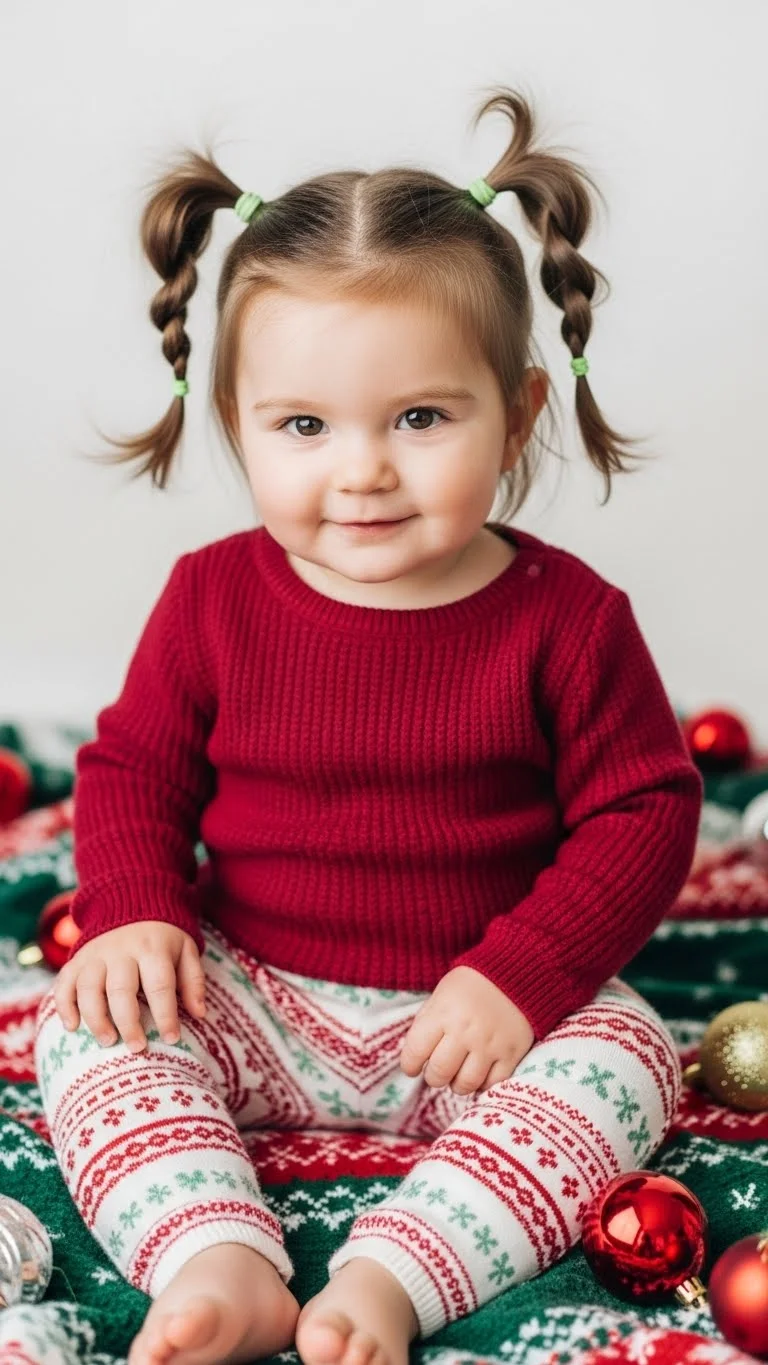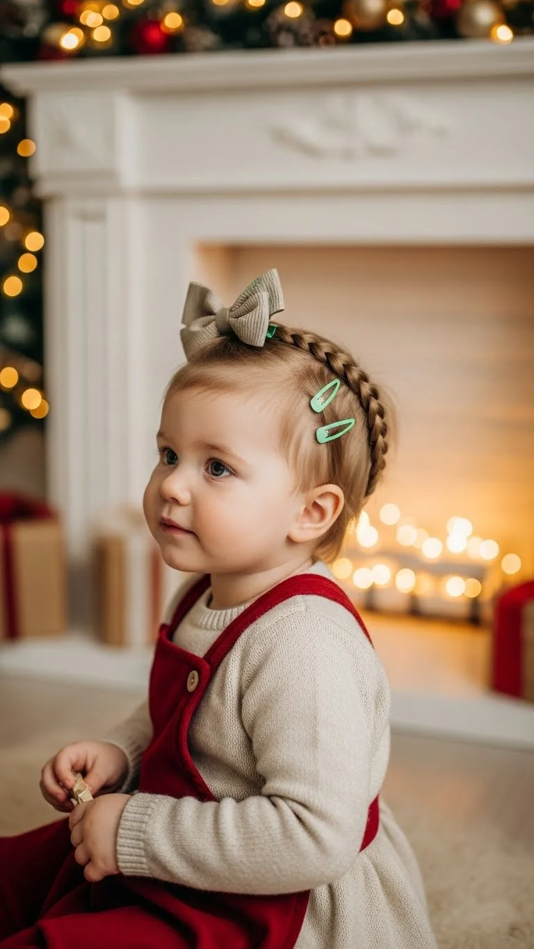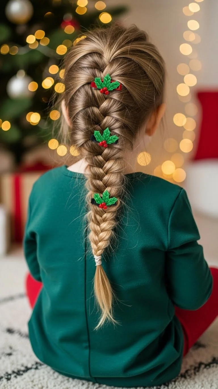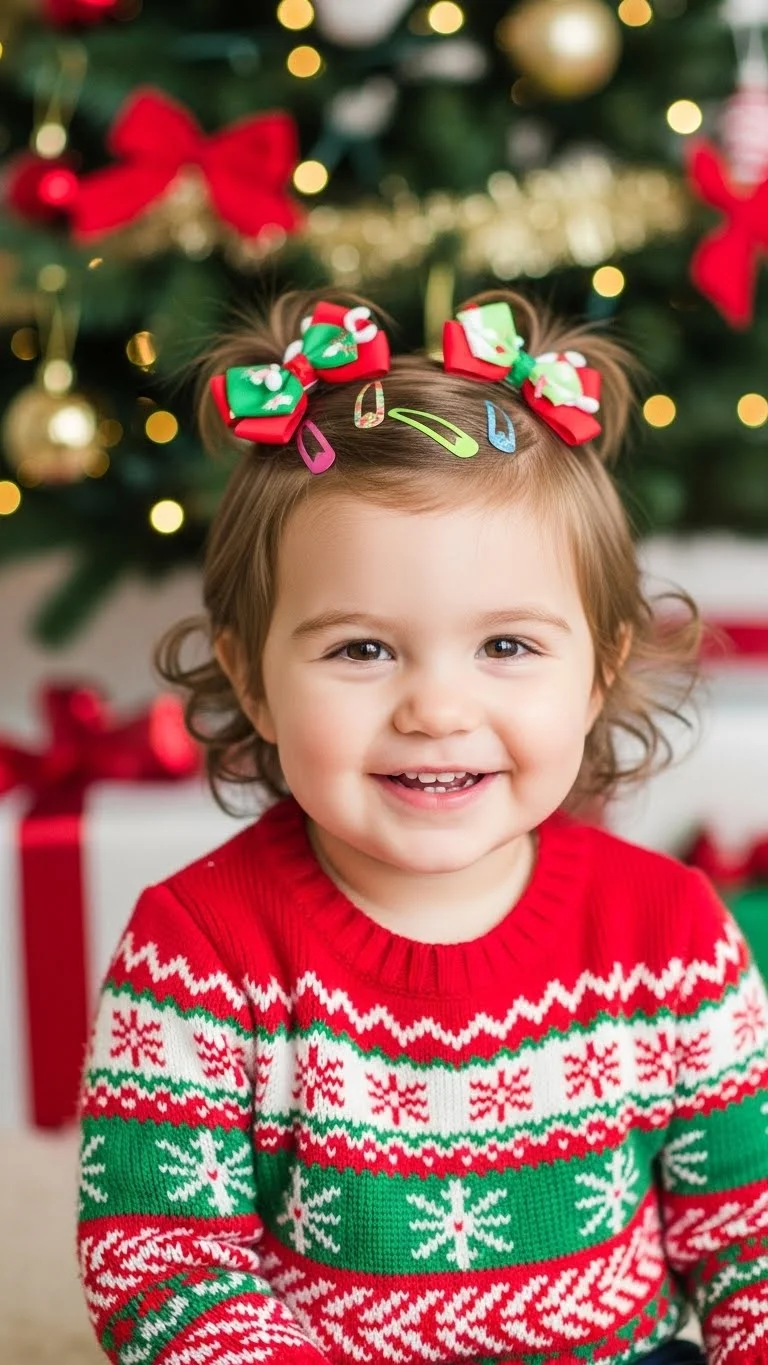 Sometimes the simplest styles are the cutest. Leave hair loose and add festive clips, tiny bows, or sparkling pins. Perfect for toddlers who dislike hairstyles but still want a holiday look. Quick, easy, and versatile. Works with all hair types. Adds instant charm and is ideal for photos, parties, or casual holiday fun.