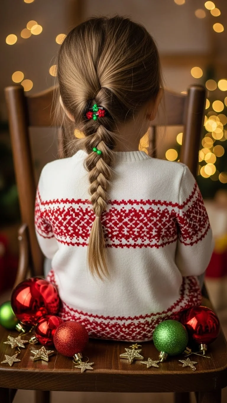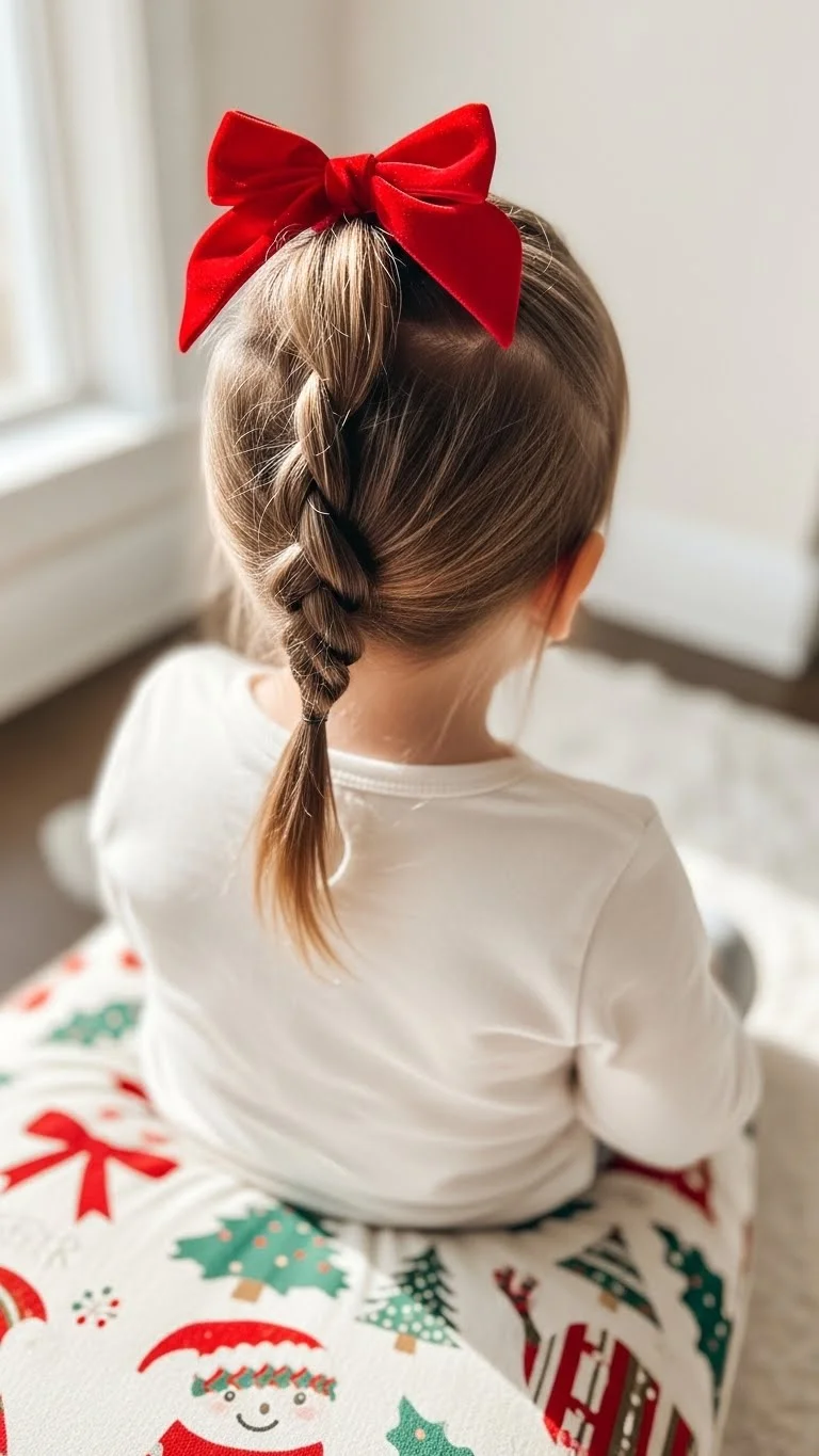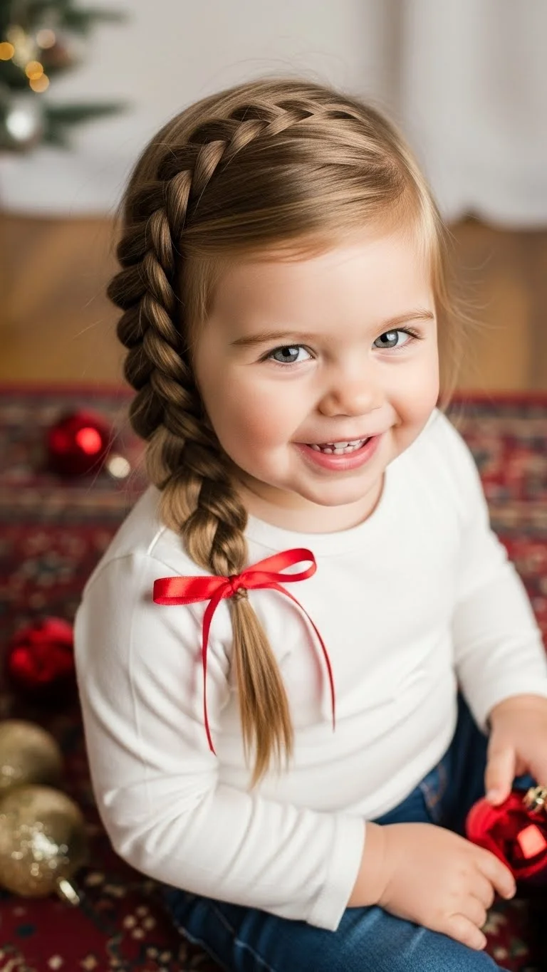 A side-swept braid is cute and simple. Sweep hair to one side, braid loosely, and secure with an elastic. Add a ribbon for a holiday touch. Keeps hair neat and manageable, perfect for photos and parties. Works well on medium hair and is easy for parents to style in minutes. Comfortable and playful, ideal for festive occasions.
