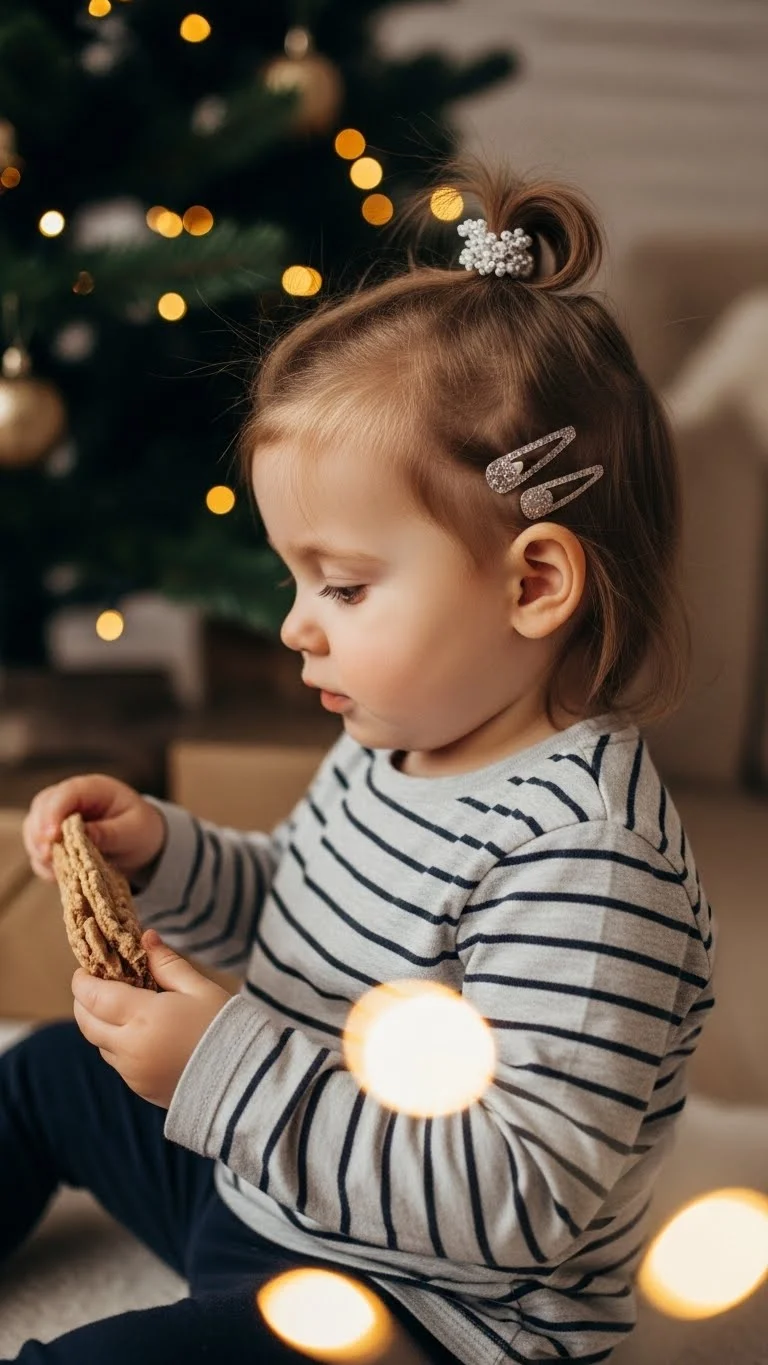 A top knot is practical for active toddlers. Gather hair at the crown and tie into a small bun. Decorate with sparkly clips for a festive touch. Comfortable, keeps hair out of the face, and looks stylish in photos. Works for medium to long hair. Quick to do and perfect for indoor or outdoor holiday activities.