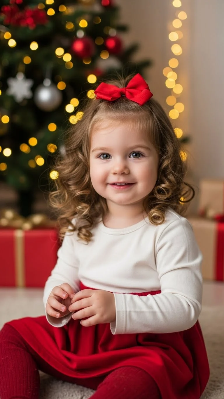 Loose curls with a bow are effortless and charming. Curl hair gently with a toddler-safe method or enhance natural waves. Pull a small front section back and tie with a festive bow. Simple, keeps hair manageable, and looks sweet for photos. Works for medium-length hair. Quick styling adds a polished finish for holiday gatherings without stress.