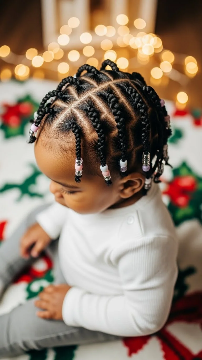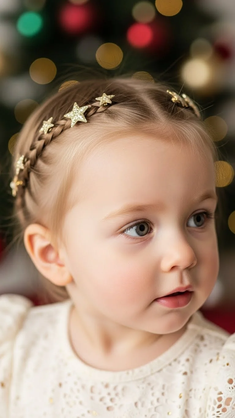 A mini braided crown adds a touch of holiday charm. Simply braid two sections from each side and pin them across the top of the head. Use bobby pins or tiny clips to secure. This style keeps hair controlled while looking polished. It’s playful yet neat for parties or family gatherings. Even toddlers with thin hair can rock this style with light-hold styling spray. Add small festive accessories like stars or bows for a cheerful finish.