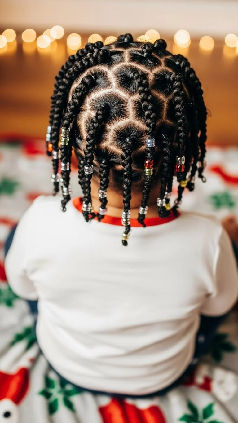 Tiny twists with beads add subtle holiday flair. Twist small sections along the front and secure with soft elastics. Add tiny beads or festive clips for charm. Great for toddlers with curly or wavy hair. Keeps hair out of the face while looking playful. Quick, comfortable, and works well for parties or casual holiday outings.