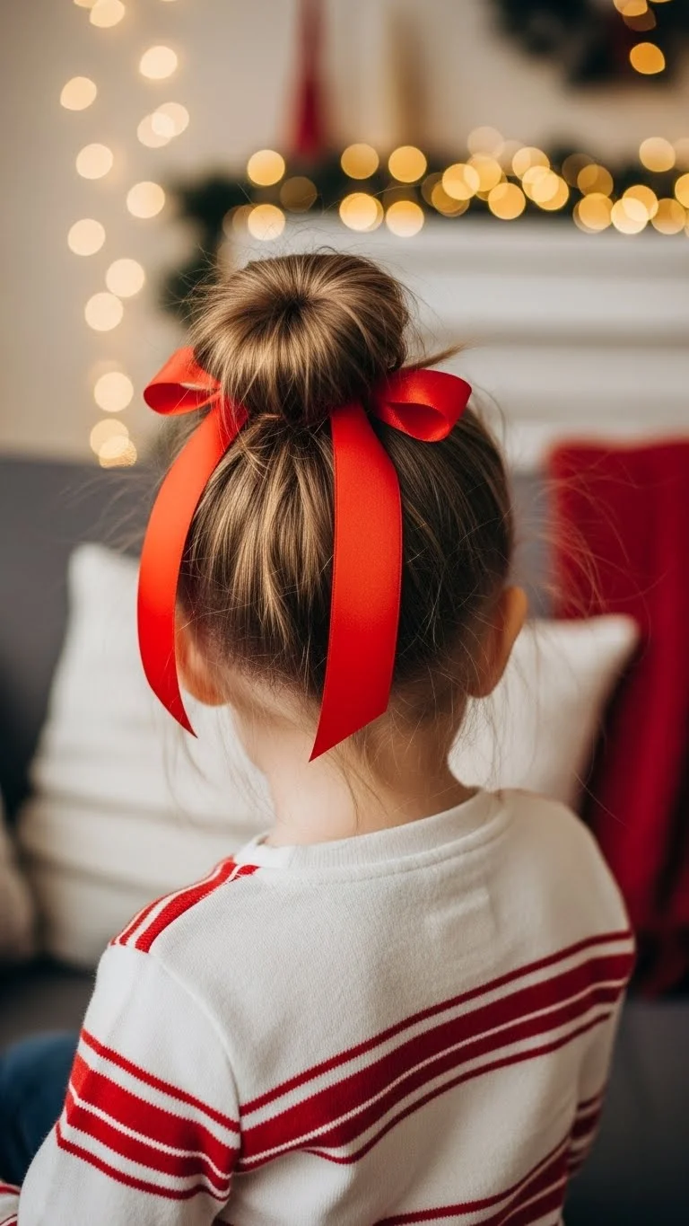 A messy bun is practical and cute. Pull hair into a loose bun and secure with a gentle elastic. Wrap a colorful ribbon around for festive flair. The style is toddler-friendly and keeps hair out of the face. Perfect for last-minute photos or casual holiday gatherings. For added texture, gently tug a few strands to soften the look. Minimal effort and maximum cuteness make this style a holiday go-to.