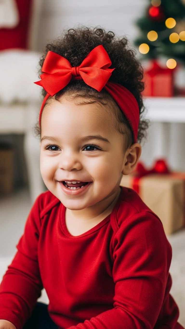 For curly-haired toddlers, a top puff adds height and fun. Gather hair into a puff and secure with an elastic. Add a bow for festive cheer. This style keeps curls intact while being easy to manage. Perfect for toddlers who are active and fidgety. Works with all curly hair lengths and textures. Quick to style and eye-catching, it pairs beautifully with holiday dresses or casual outfits for a charming seasonal look.